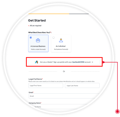 Click the Start Here icon above or select the button with the AuctionACCESS logo on the Registration page when you sign up as a business.